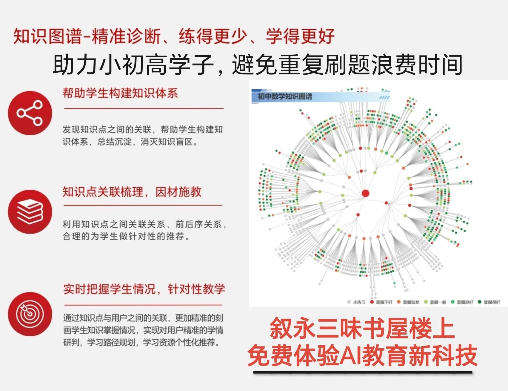 叙永三味书屋楼上开了家教育新科技的读书郎AI智习室,接入了教育AI大模型,你做过的5.3和各种品牌的练习册以及测试卷,分分钟帮你扫描整理出错题分析,还可以打印出归类的错题集,避免重复刷题,绝不浪费时间;还可以精准列出与错题相关的知识图谱,梳理出学习的误区和薄弱环节,指导你哪里不会学哪里,精准补习知识漏洞。